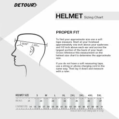 The circumference of the head should be measured at a point approximately one inch above the eyebrows in front and at a point in the back of the head that results in the largest possible measurement. Take several measurements. The largest measurement is the one you want to try on first. If you use a balaclava or head sock, always measure and fit the helmet with it on. Use the Detour Helmets sizing chart to determine the size that best matches the head measurement.Â