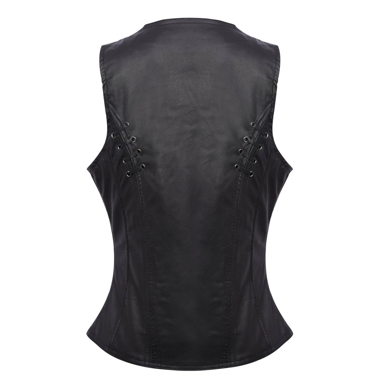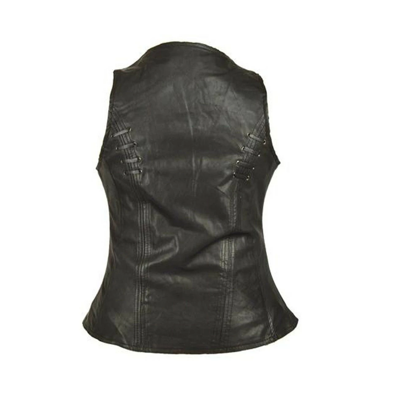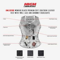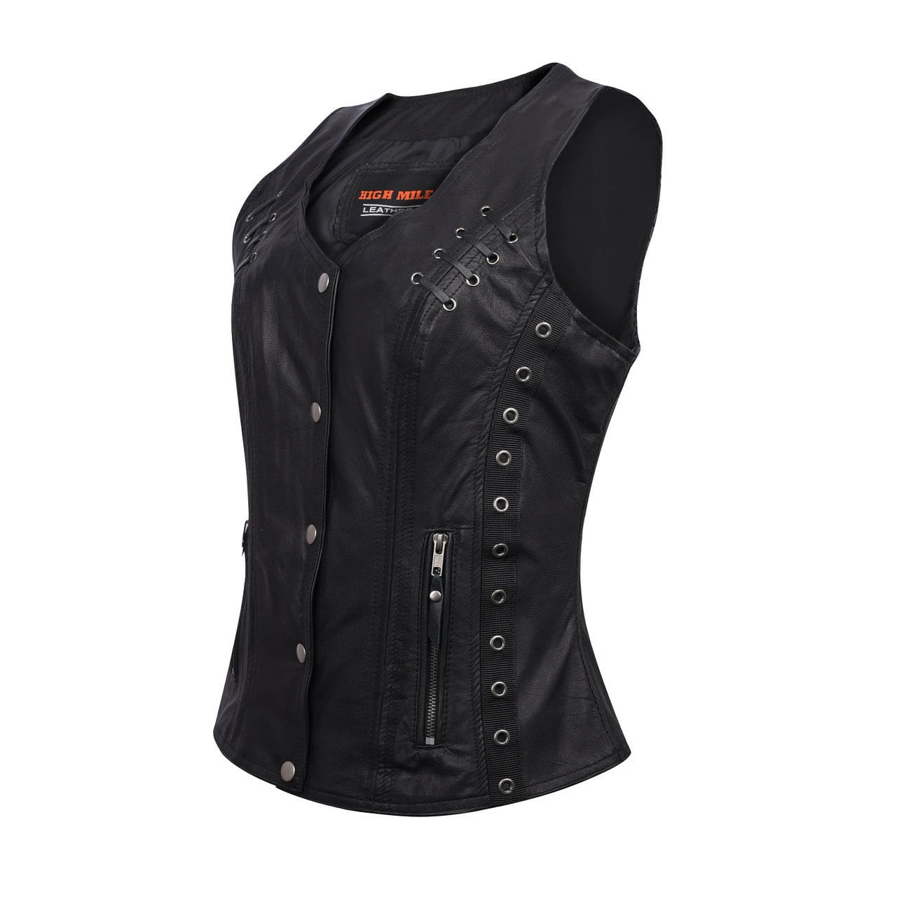 High Mileage HML1038B Womens Black Premium Soft Goatskin Leather Vest With Twill Lace and Grommet Highlights.