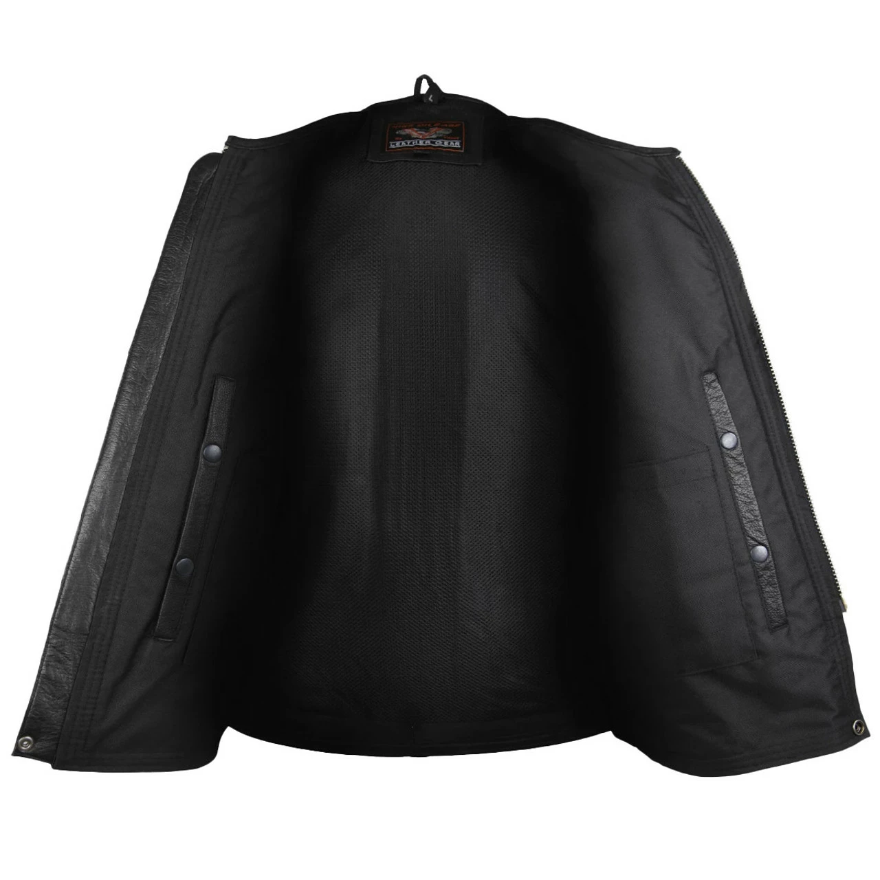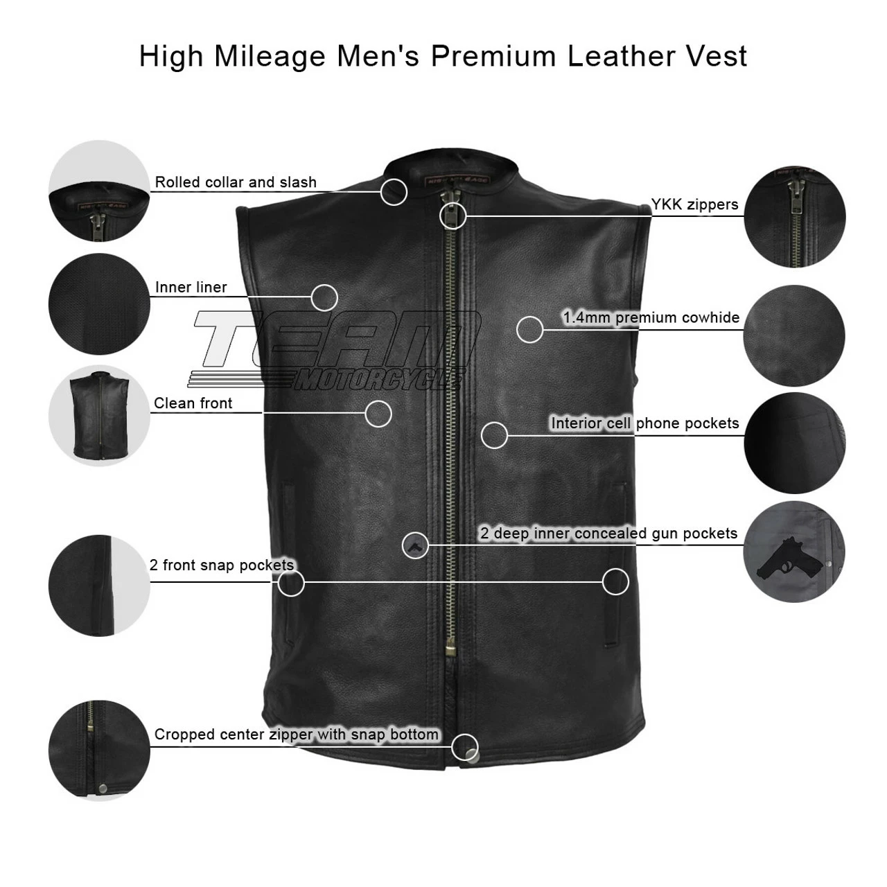 High Mileage HMM932 Mens Black Premium Cowhide Front Center Zipper Biker Motorcycle Leather Vest.