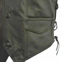 Enjoy this classic biker leather vest with detailed braided accents and single panel great for patches. This is a good quality leather vest which will last for many years
