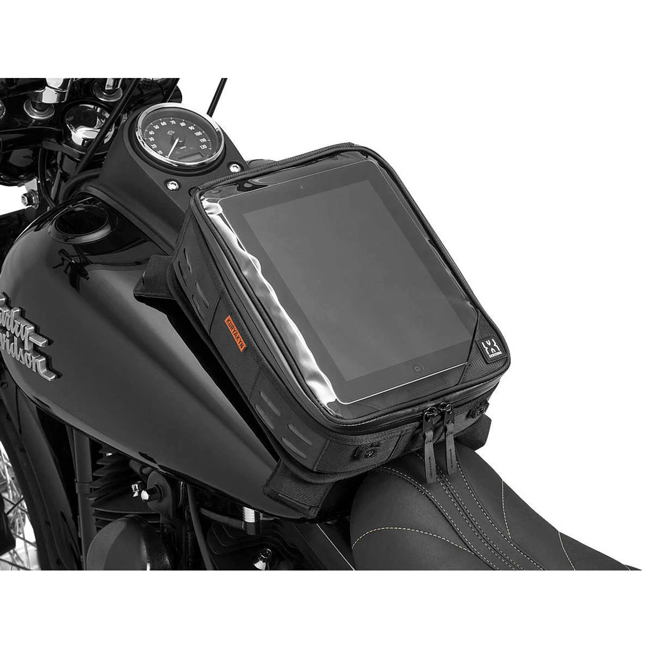 The convenience of a do-it-all tank bag with updated features for 21st-century riders. Low-profile design with a clear weather-resistant display screen for GPS, tablets or maps, and plenty of storage to easily stow and access the essentials.