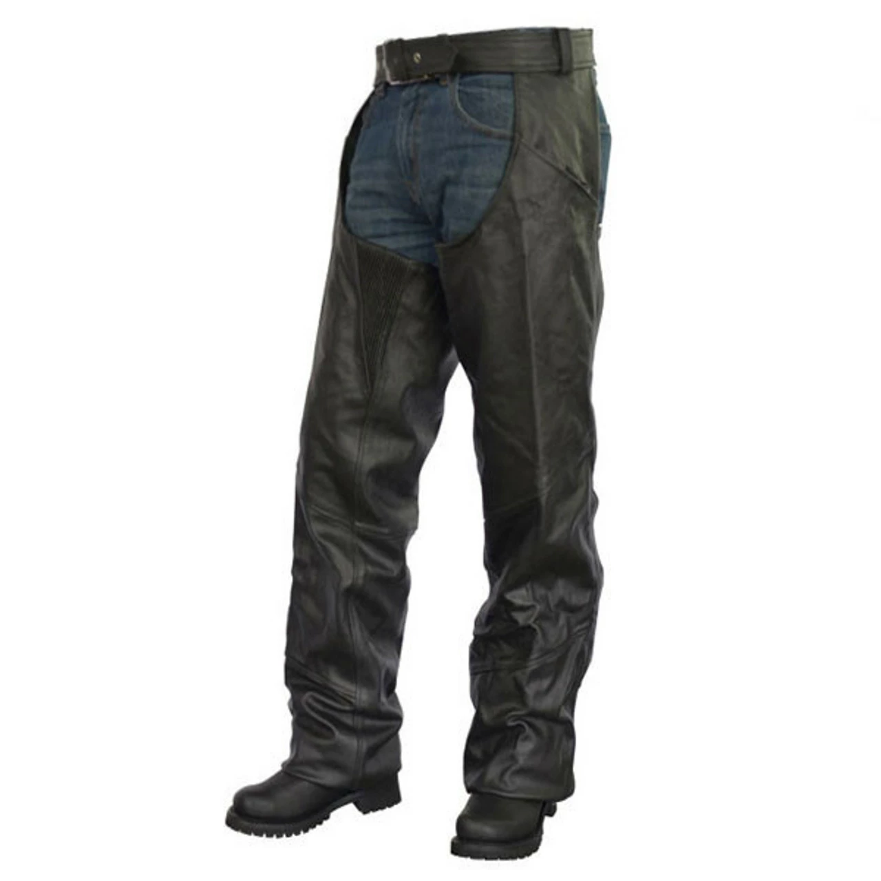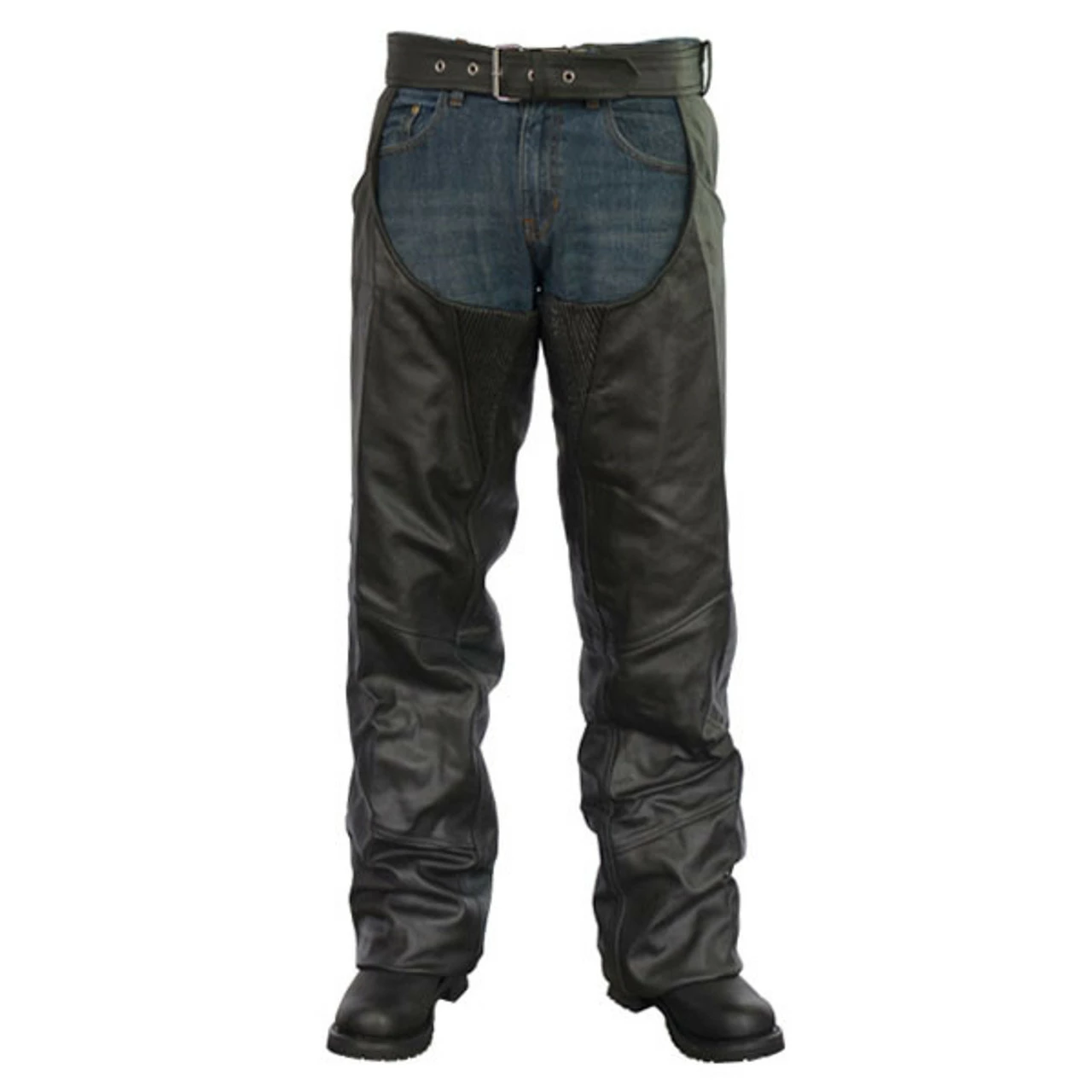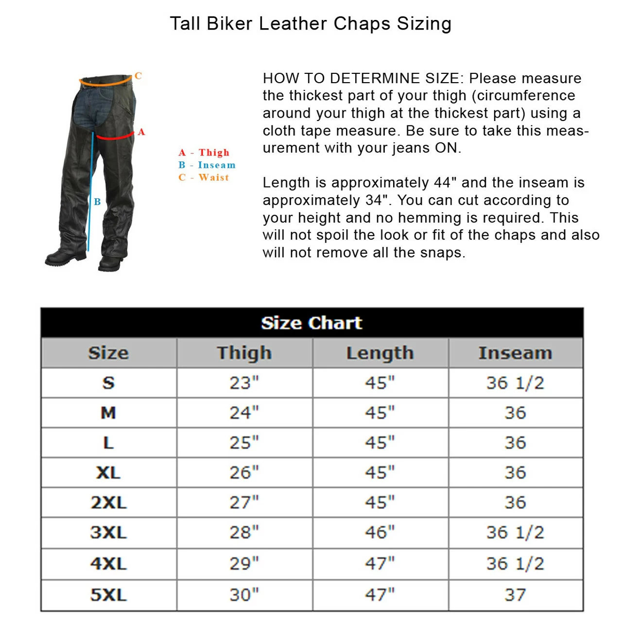 Tall Chaps, Mens Plain Biker Leather Chaps are made for our riders blessed with longer legs. They are crafted from premium leather and boast a stretch panel in the groin area for more comfort and for a better fit. These chaps are available in a wide range of sizes for the tall rider, from S to 5XL. The leg length for the S to 2XL is 45 inches; for 3XL, it is 46 inches; and for 4XL to 5XL, it is 47 inches. These chaps have an unfinished bottom so that you can cut them to your size. These tall chaps have a fixed nylon mesh line, and they also come with a removable quilted thermal liner for those days or mornings when there is a chill in the air.