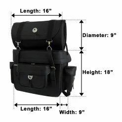 - Larger of the sissy bar bags is HUGE. 18 inches x 16 inches x 9 inches. It has plenty of extra storage space in the small zip closure pockets on the sides of the bag. The round bag is 16 inch long by 9 inch diameter to allow for plenty of storage space.