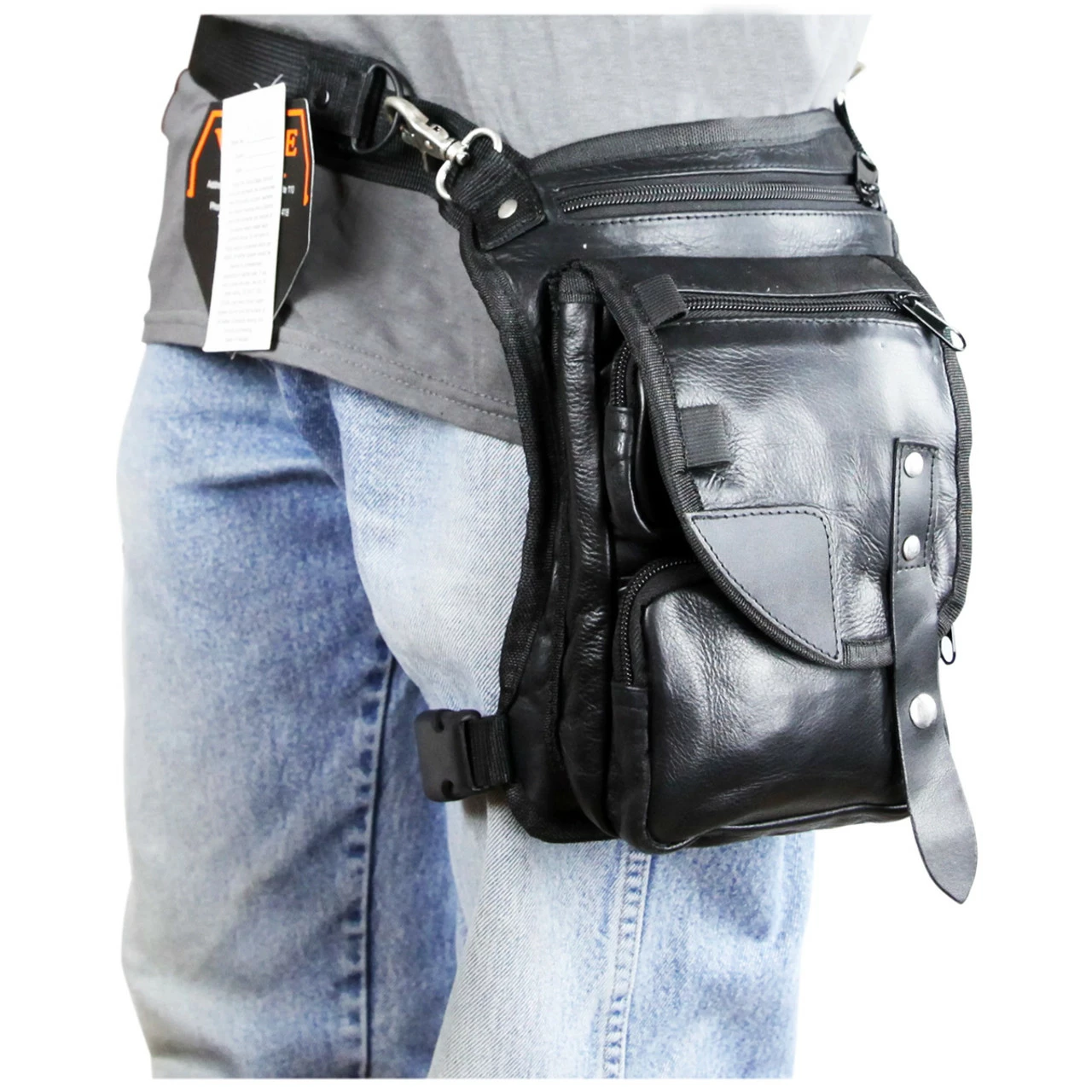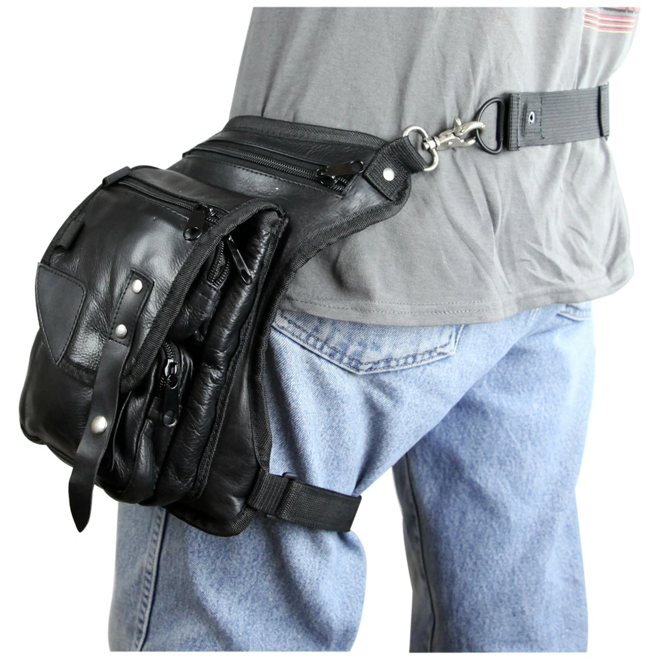 Vance VA565 Men and Women Black Leather Multi-Function Concealed Carry Biker Motorcycle Drop Leg Fanny Pack Thigh Bag.