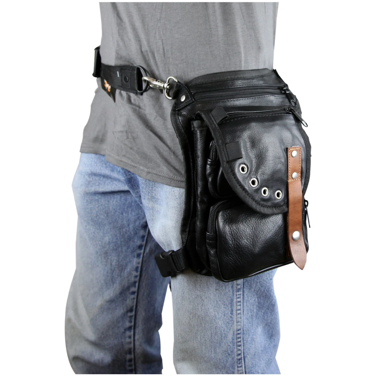 Vance VA566 Men and Women Black Leather Multi-Function Concealed Carry Biker Motorcycle Drop Leg Fanny Pack Thigh Bag.