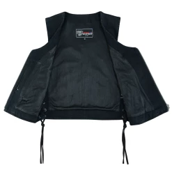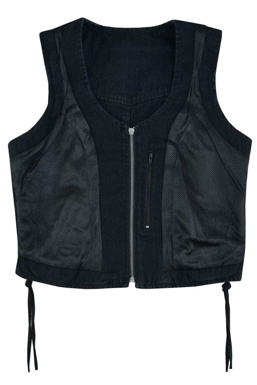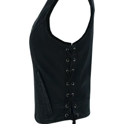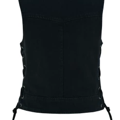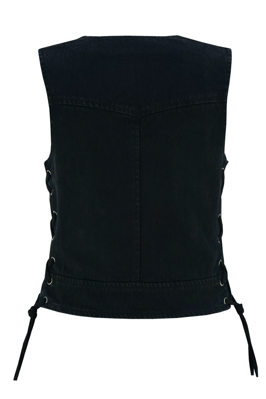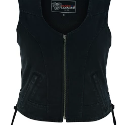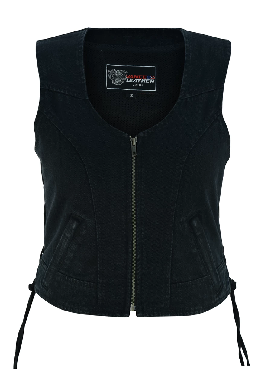 Vance VB1042BK Women’s Black Denim V Neck Vest with Zipper & side laces Motorcycle Vest