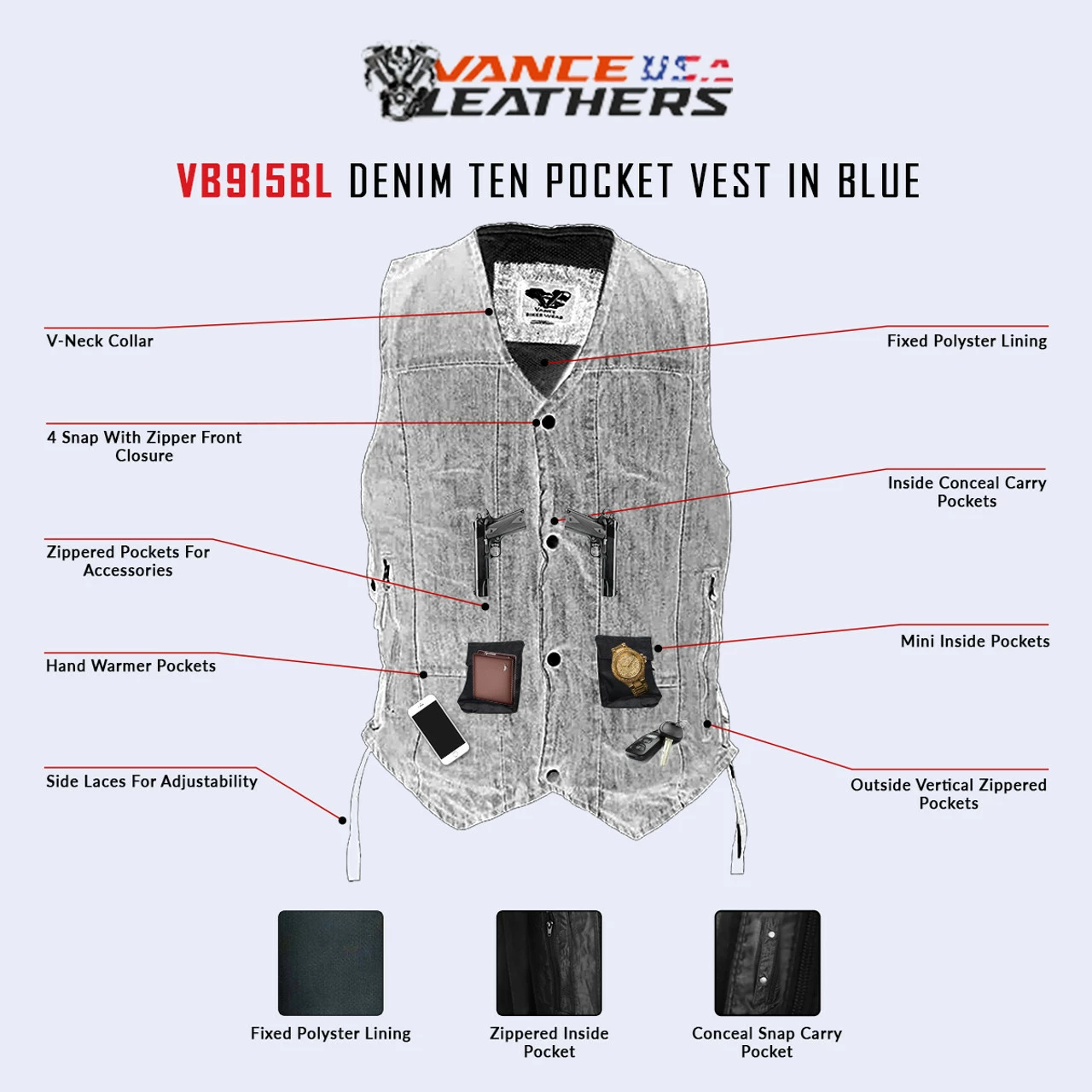 Vance VB915Blue Mens Blue Ten Pocket Denim Motorcycle Vest.