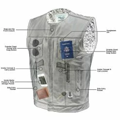 Vance VL919GS Men’s Black Premium Cowhide Leather Biker Motorcycle Vest With Quick Access Conceal Carry Pockets and Gray Stitching.