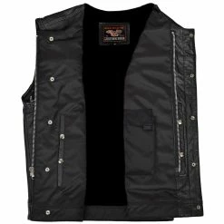 Vance VL919GS Men’s Black Premium Cowhide Leather Biker Motorcycle Vest With Quick Access Conceal Carry Pockets and Gray Stitching.