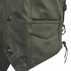 Men’s Lace Side Braid Vest with 2 inside conceal carry pockets and 2 outside pockets and is made of premium leather. Single horizontal seam on the back.This vest is ideal for all those patches to attach to the back.