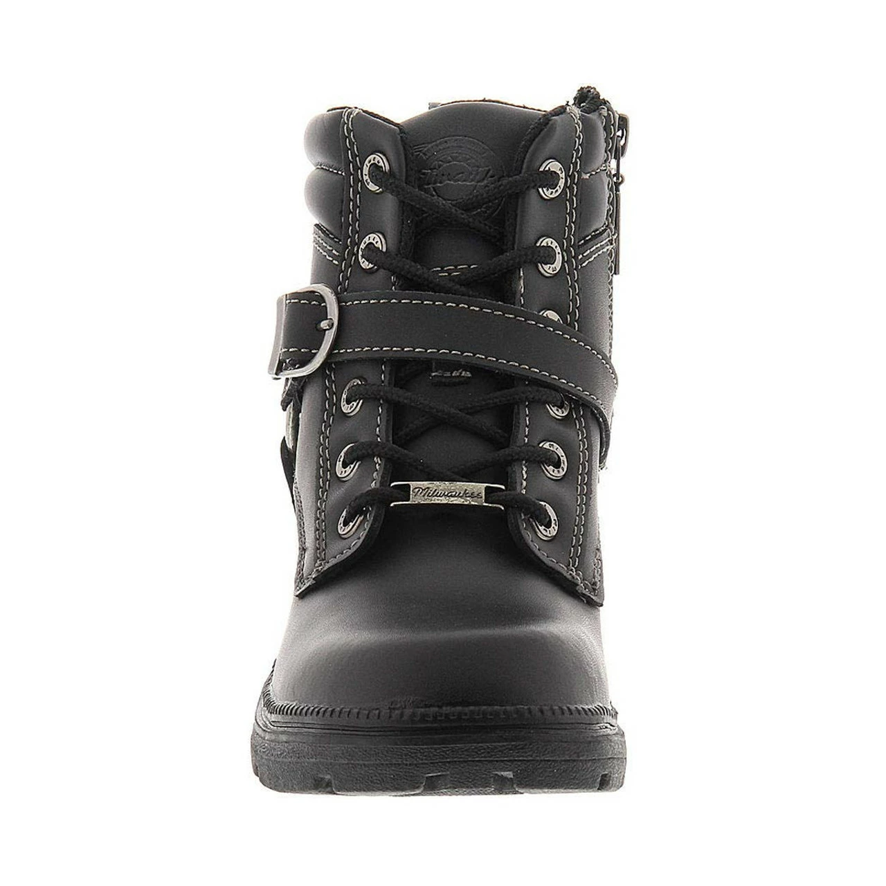 The ladies Paragon by Milwaukee Motorcycle Clothing Company is a light weight leather riding boot. Lace-up boot with classic o-ring and buckle. Also features an easy pull-on tab on back and inside side zipper. Inside each pair, we offer Freedom Flex Construction. The mid-sole of these unique boots is crafted to conform to the natural bend of the arch of your foot allowing you to bend and move more freely. Light weight cement construction outsole with removeable washable insoles.