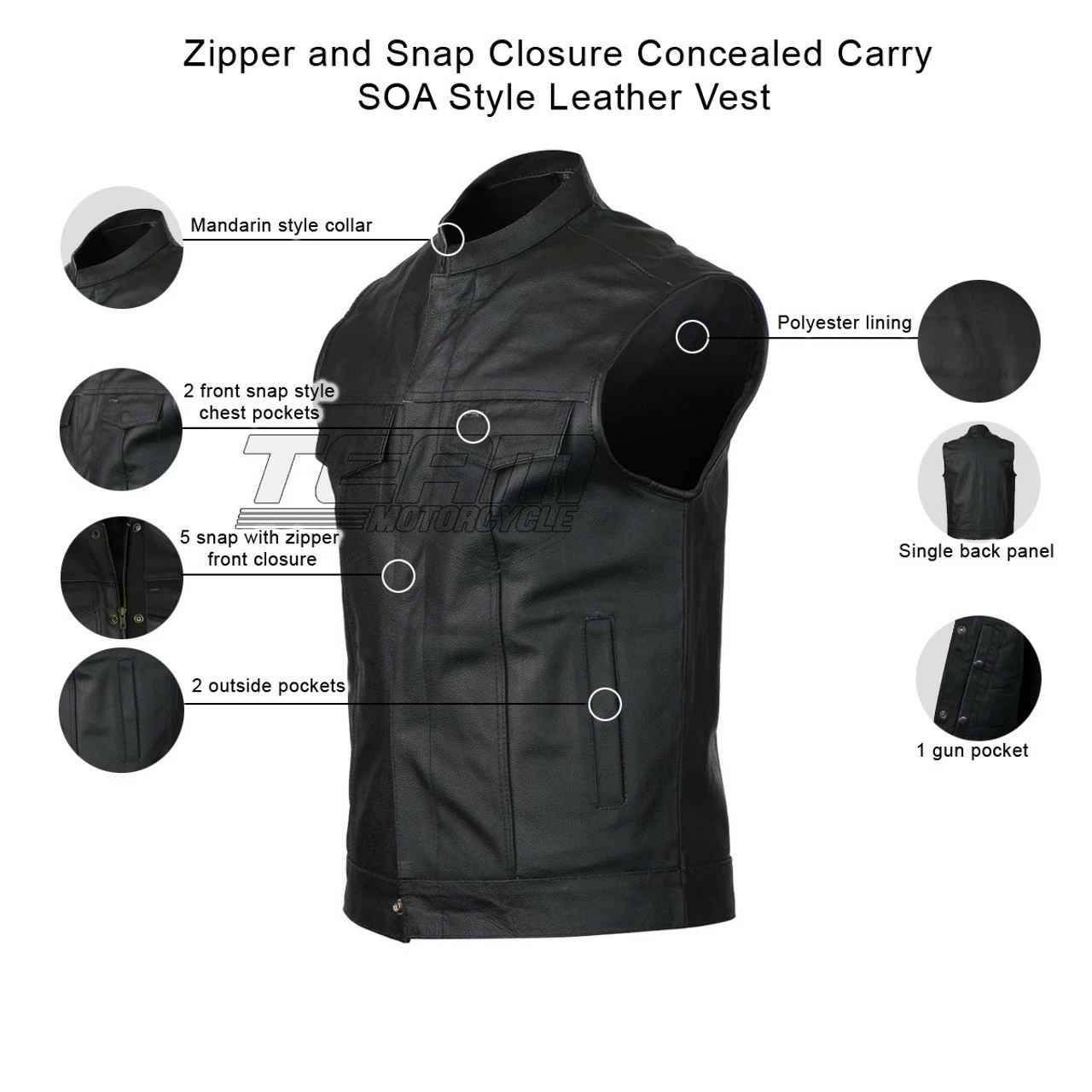 Zipper and Snap Closure Concealed Carry SOA Style Leather Vest.